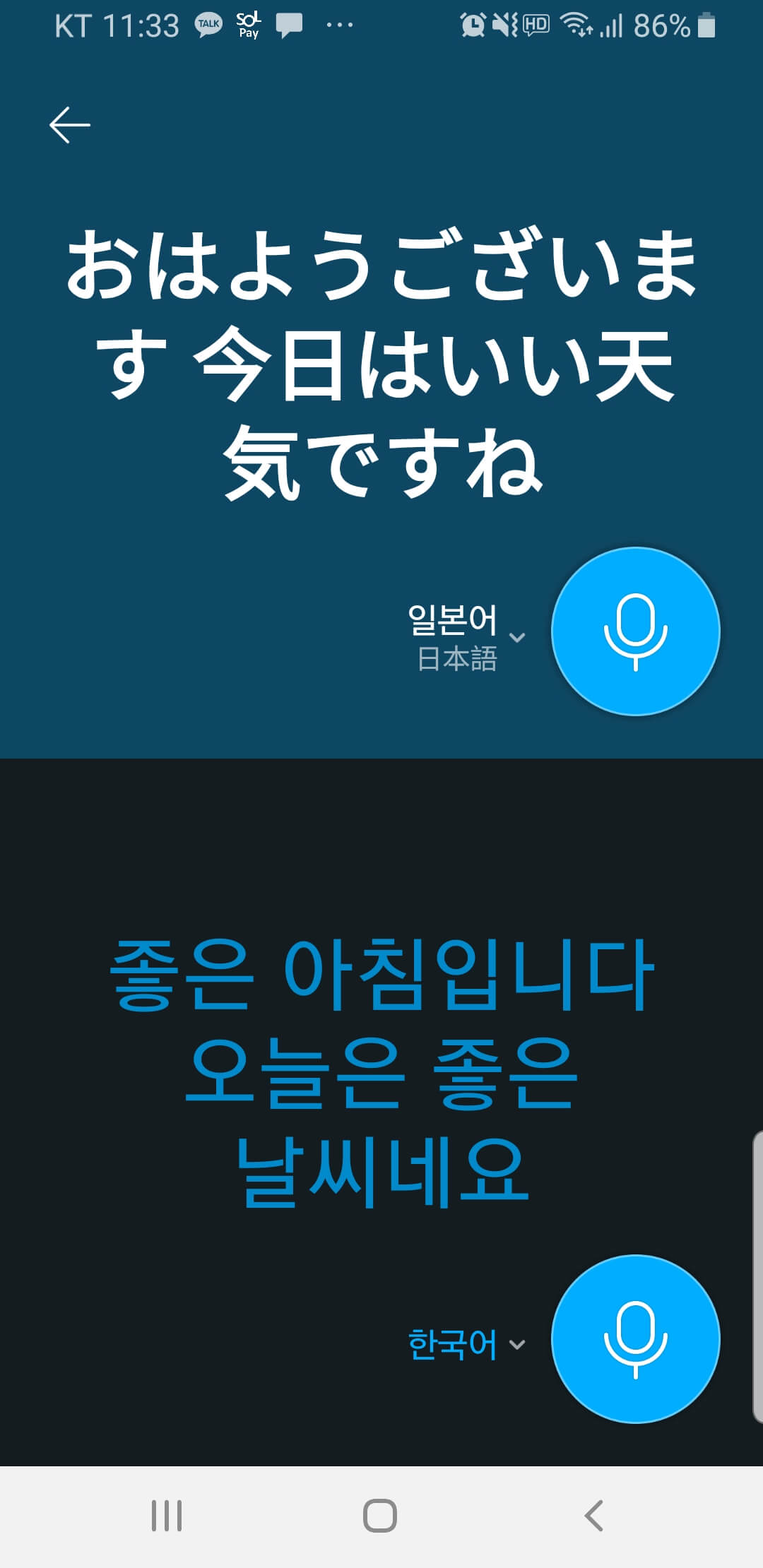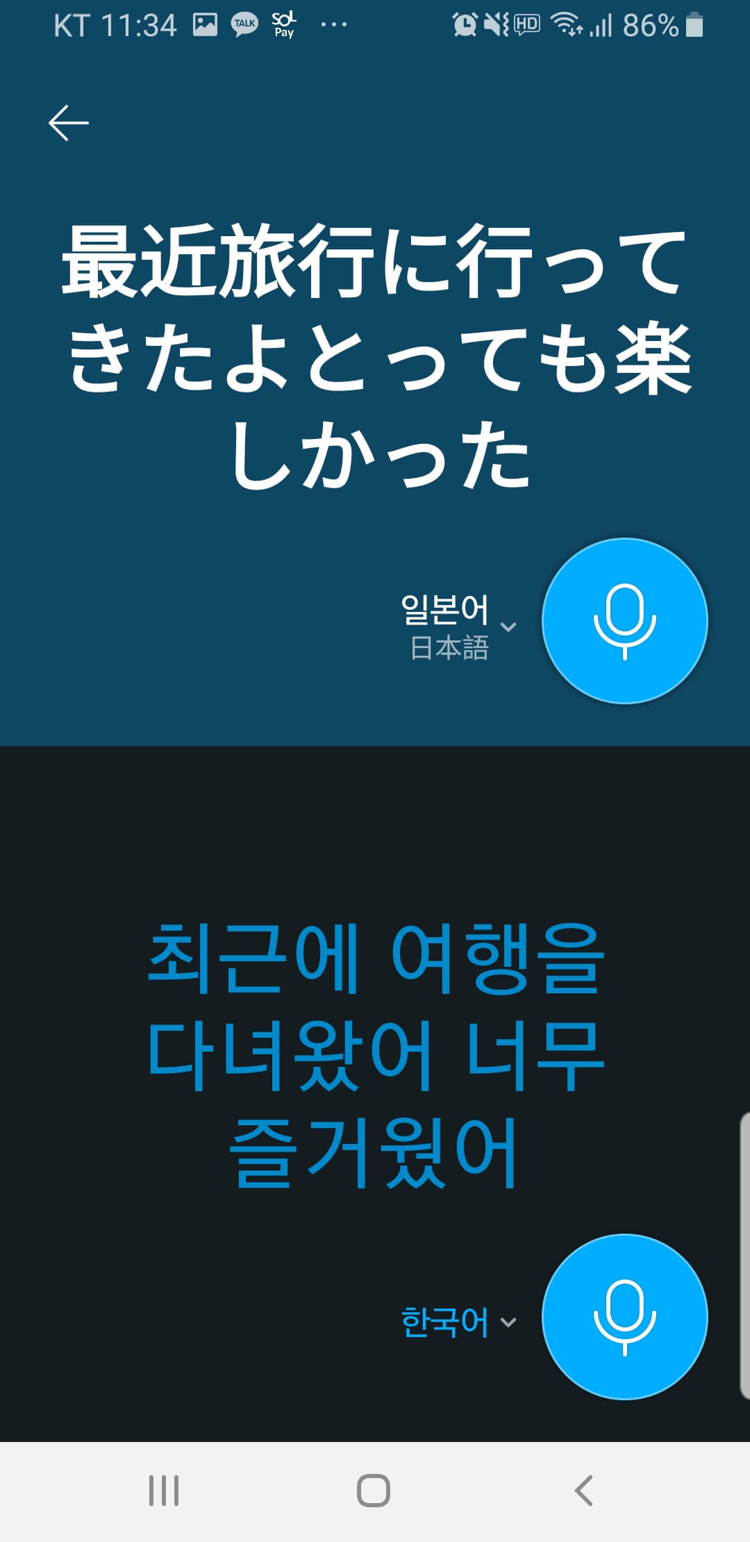 - 가운데 그림은 직접 일본어로 말해서 넣은 것이고 아랫부분은 해석이 되어 나오면서 음성도 물론 같이 나온 것입니다. 여기서 중요한 것은 시간이 1~3초 사이에 결과가 나와 상대방(일본인)과 대화하는 데 별 어려움이 없이 진행이 됩니다. 업그레이드되기 전보다 훨씬 정제되고 빨라졌습니다.