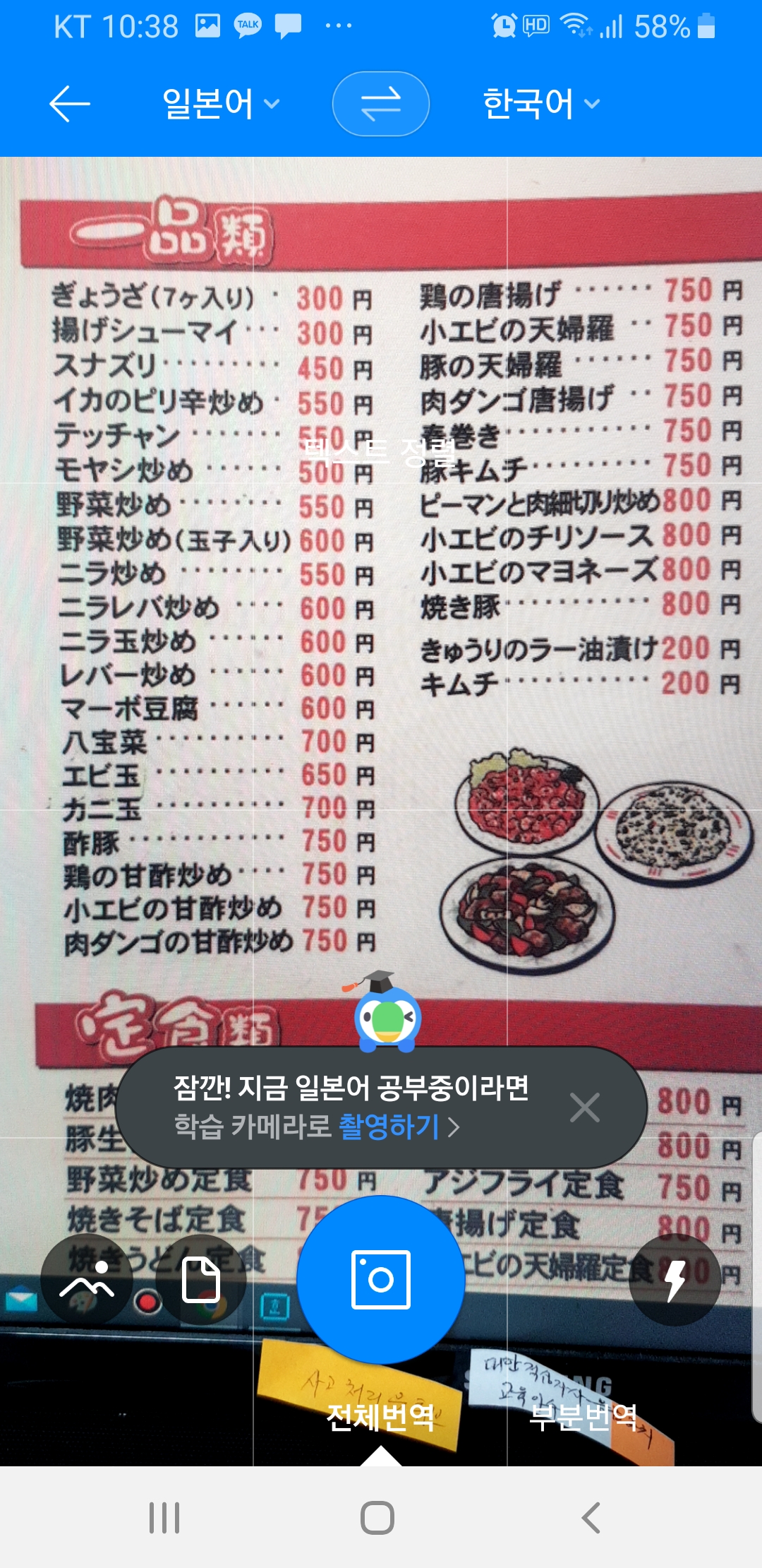 - 왼쪽이 일본메뉴를 파파고로 이미지 촬영을 한것이고 가운데 아래쪽의 전체번역을 클릭하면 가운데 그림처럼 한국어로 해석되어 나옵니다. 나오는 시간은 3~4초 정도 걸렸던 같습니다. 한국어로 번역된 것을 보면 대체적으로 무슨 말인지 알아볼 수 있습니다.