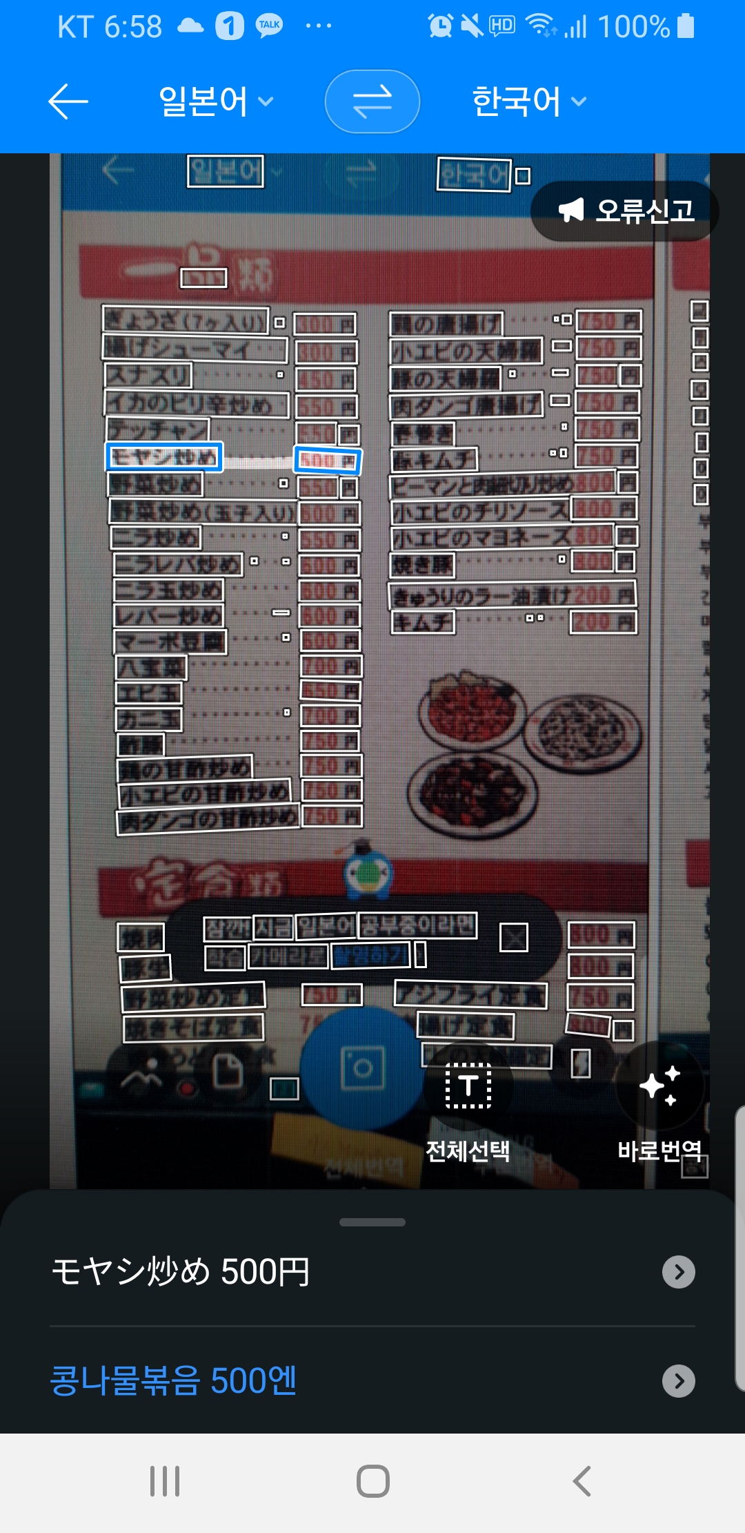 - 그리고 이 메뉴의 전체에서 부분적으로 알고 싶을 때에는 가운데 오른쪽 아래에 있는 바로번역을 누르시면 오른쪽의 그림이 나옵니다. 여기서 왼쪽위쪽의 파란색의 네모박스 2개는 제가 직접 손가락으로 알고 싶은 곳을 문지른 것입니다. 그리고 그 문지른 결과 제일 아래칸에 해석이 되어 나온 것입니다.