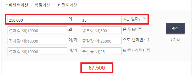 250,000 × 35 ÷ 100 = 87,500원이 됩니다.