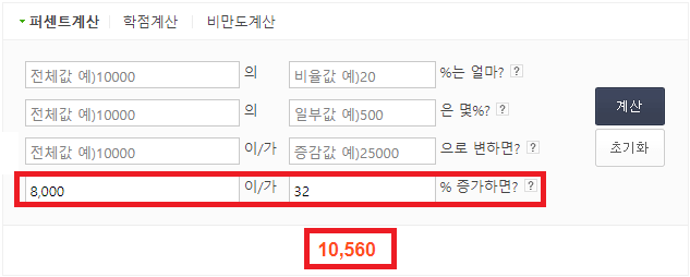 Q : 어느 대학교의 총 학생수가 8,000명인데 32%가 증가한다면 몇 명이 될까?