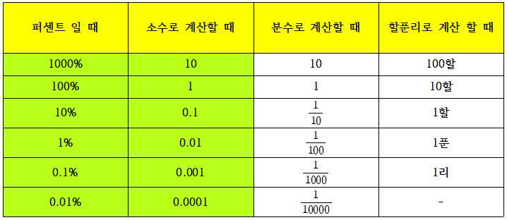 예) 10% = 0.1 = 1/10 = 1할